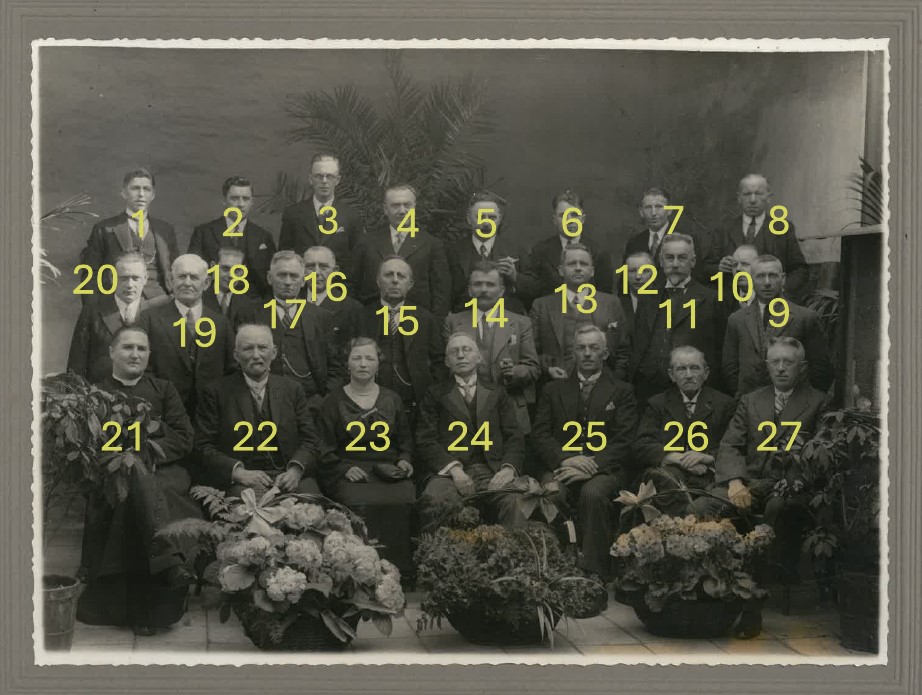 De vier potten met bloeiende planten op de voorgrond zouden kunnen duiden op een jubileum. De persoon zittend in het midden (24) zou wel eens de jubilaris kunnen zijn, gezien de prominente plek die hij inneemt op de foto. De foto moet gemaakt zijn tussen 1932 en 1936. In 1932 trad dhr. Dings (1) toe tot de LLTB, en in 1936 overleed dhr. Tops (15) als gevolg van een auto-ongeluk.