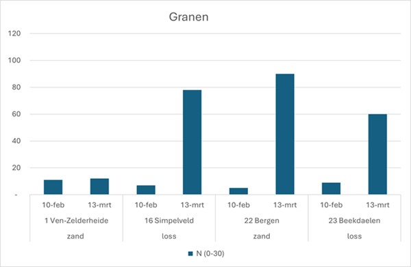 Een eerste bemesting heeft op sommige referentiepercelen al plaatsgevonden. Waar werd bijbemest, is dit ook in de Nmin-waarden terug te zien, bijvoorbeeld op de percelen 16, 22 en 23, waar een stijging van de Nmin-waarde onder de 10 kg/ha begin februari naar waardes van resp. 80kg/ha, 90kg/ha en 60 kg/ha werd vastgesteld. Dit correspondeert met de uitgevoerde bemesting op deze percelen. Wintergranen hebben in het vroege voorjaar een vrij grote stikstofbehoefte om een goede uitstoeling en hergroei te realiseren. In de laag 0-30 cm is een voorraad van 80-100 kg N/ha gewenst in deze fase.
