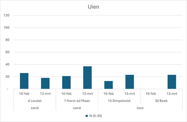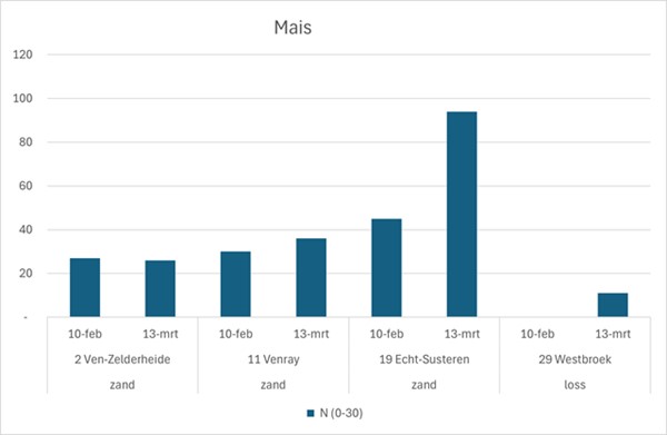 De hoogste gemeten Nmin-waarde op een perceel zonder bemesting werd vastgesteld in Echt-Susteren met 95 kg/ha ten opzichte van 45 kg/ha in februari. Hoewel daar sinds het laatste hoofdgewas prei geen bemesting meer heeft plaatsgevonden zijn er 45-50 kg/ha N beschikbaar gekomen. Dat is een erg hoge mineralisatie voor deze periode van het jaar. Zelfs als in ogenschouw wordt genomen dat gewasresten van het laat geoogste preigewas mogelijk aan het mineraliseren zijn.